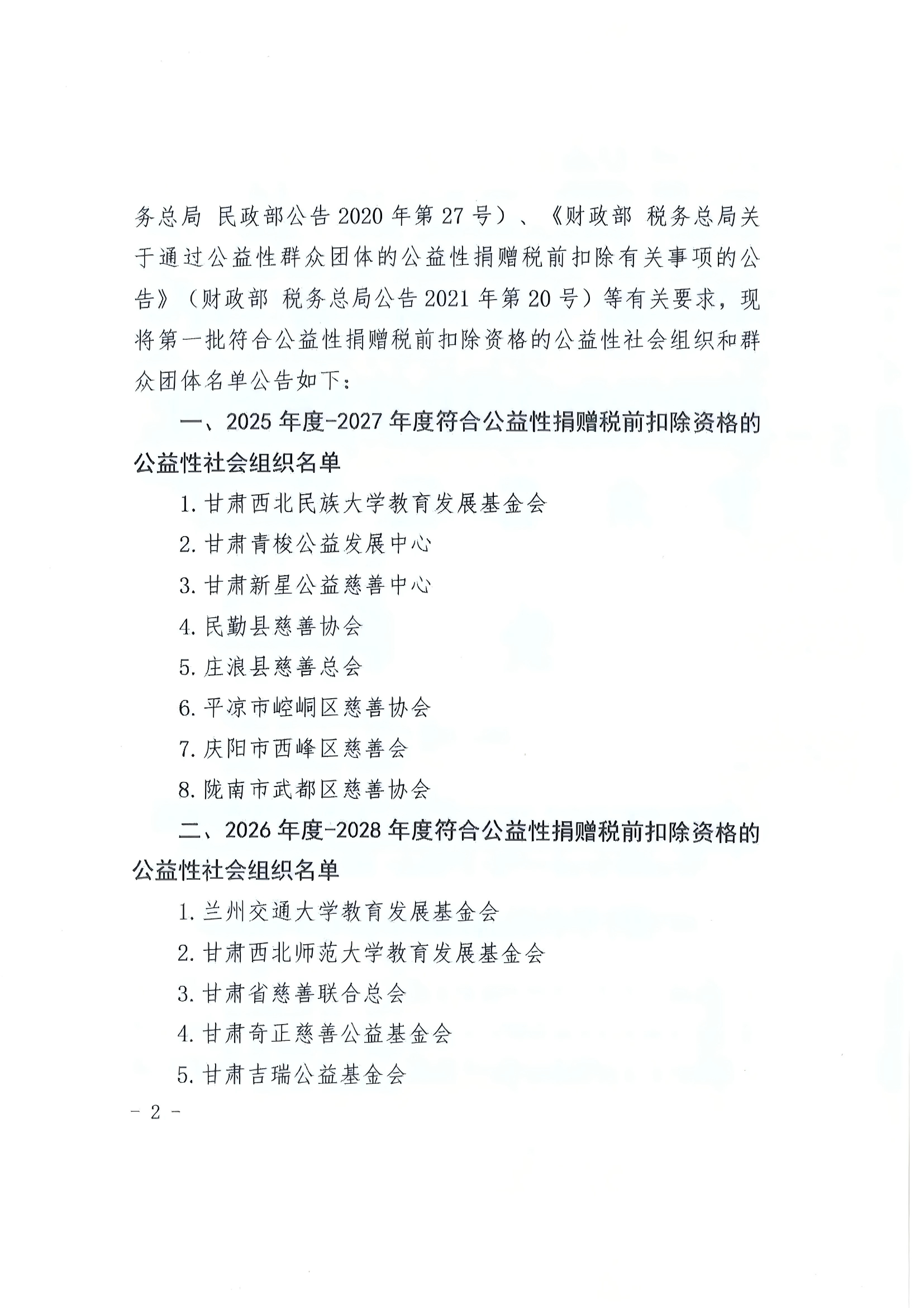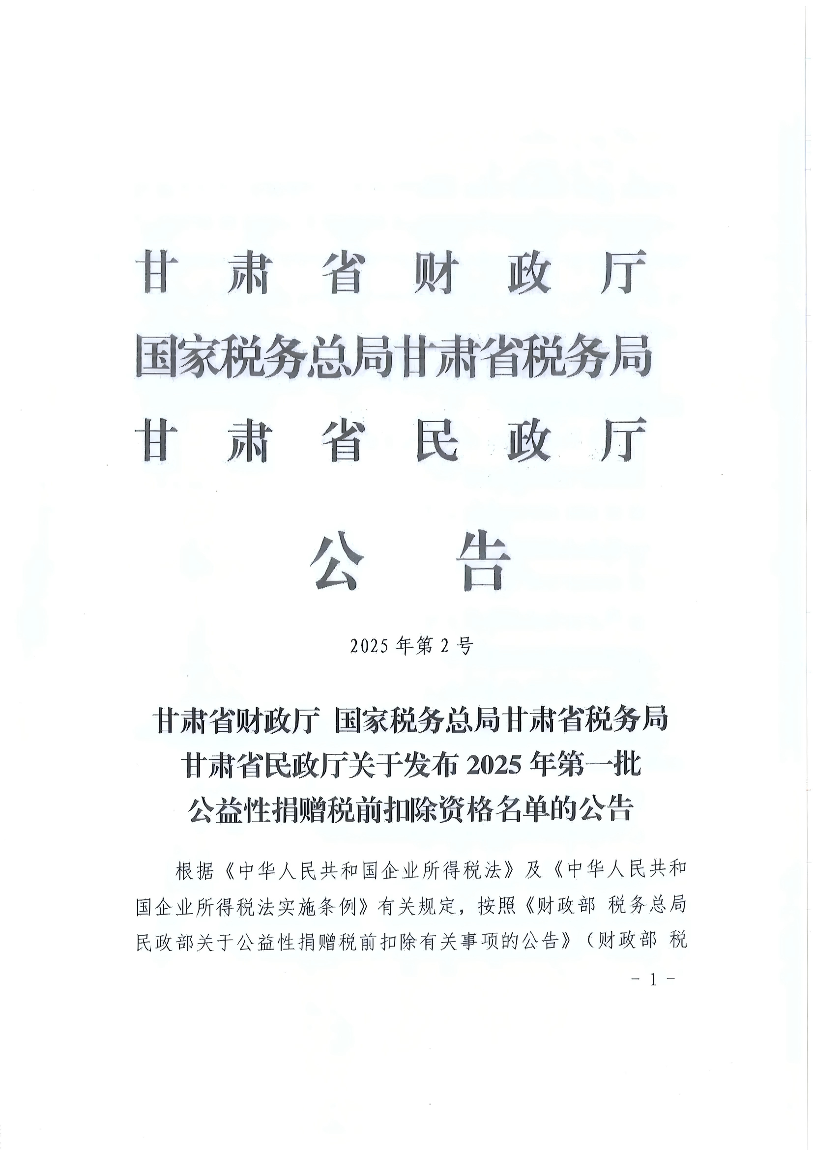 公告| 甘肅省財政廳國家稅務總局甘肅省稅務局甘肅省民政廳關于發(fā)布 2025年第一批公益性捐贈稅前扣除資格名單的公告